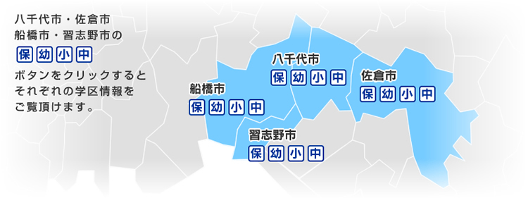 八千代市・佐倉市・船橋市・習志野市の保育園・幼稚園・小学校・中学校の学区のご紹介です。 住所からそのエリアの学区を調べる事が出来ます。